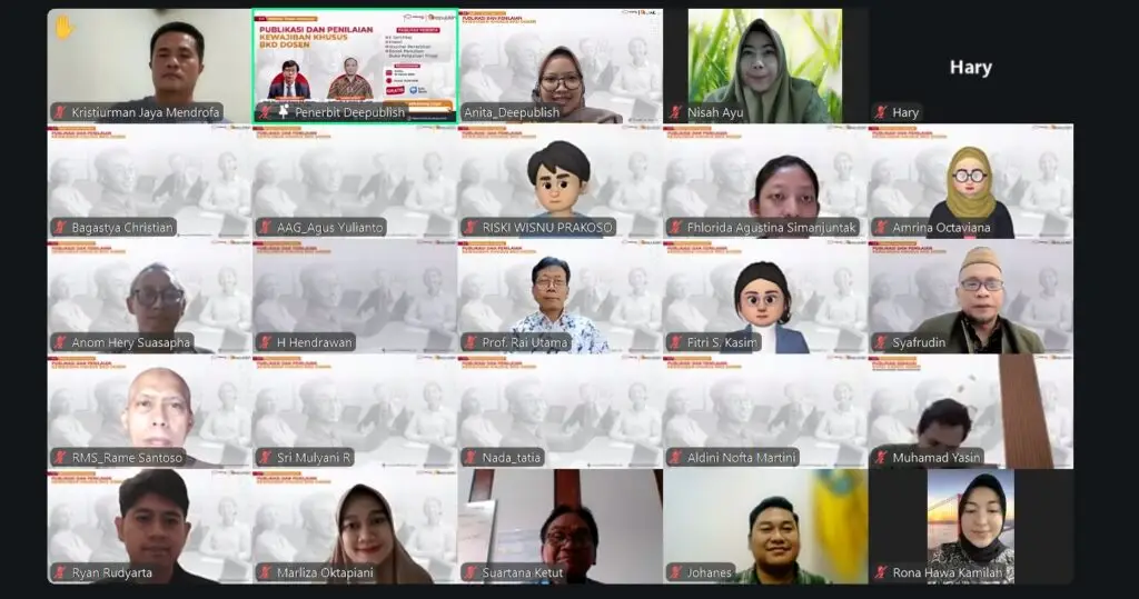 Penerbit Deepublish bekerja sama dengan DuniaDosen.com sukses menyelenggarakan Webinar Dosen Indonesia bertema “Publikasi dan Penilaian Kewajiban Khusus BKD Dosen” pada Senin, 16 Maret 2026. Kegiatan yang dilaksanakan secara daring melalui platform Zoom Meeting ini diikuti oleh para dosen, tenaga pendidik, serta akademisi dari berbagai perguruan tinggi negeri dan swasta di seluruh Indonesia. Para peserta tampak antusias untuk memperdalam pemahaman mengenai kewajiban publikasi ilmiah serta sistem penilaian Beban Kerja Dosen (BKD).